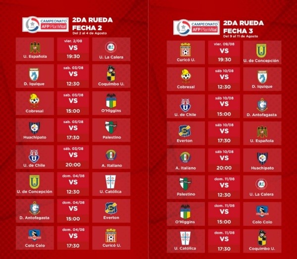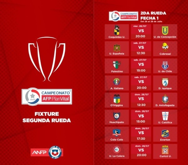 Como ya es sabido, el campeonato vuelve al ruedo el viernes 26 de julio. Ese fin de semana Universidad de Chile visitará a Palestino, Católica a Huachipato y Colo Colo será local contra Everton.