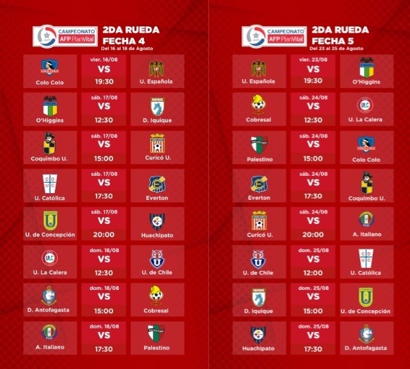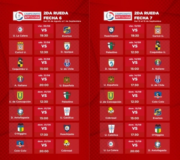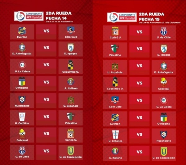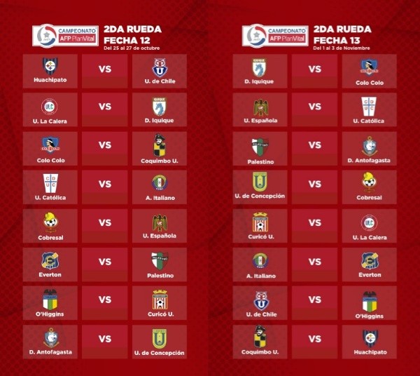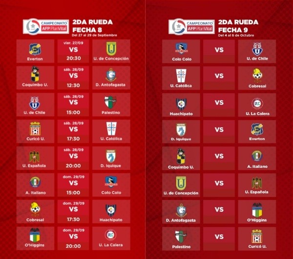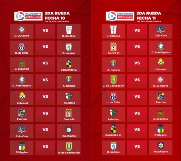 Mientras, la Católica será dueña de casa contra Colo Colo el fin de semana del 18 al 20 de octubre por la decimoprimera jornada del Torneo Nacional.