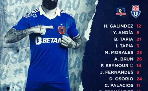 La U formará con Hernán Galíndez; Yonathan Andía, Ignacio Tapia, Bastián Tapia y Marcelo Morales; Felipe Seymour (C), Álvaro Brun,Darío Osorio yJunior Fernandes;Ronnie Fernández y Cristián Palacios.En la banca estarán Cristóbal Campos, José María Carrasco, Pablo Aránguiz, Jeisson Vargas, Camilo Moya, Luis Felipe Gallegos y Simón Contreras.