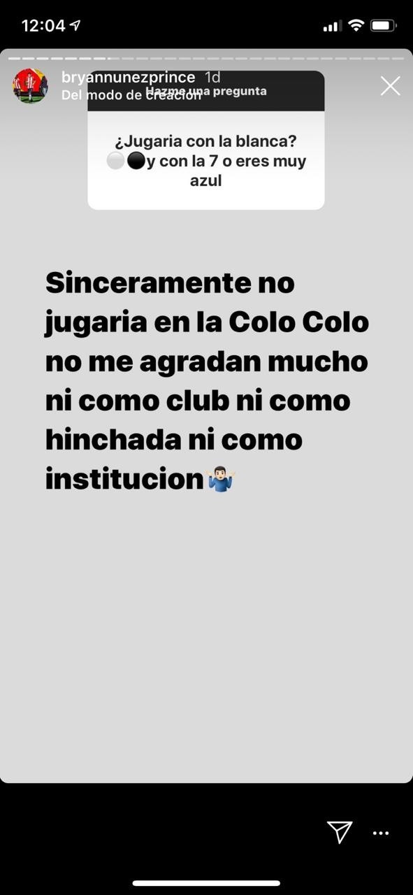 Al momento de ser consultado por Colo Colo, Bryan Núñez aclaró que nunca jugaría en el conjunto Albo. “Sinceramente no iría a Colo Colo, no me agradan mucho como club, ni como hinchada, ni como institución”, expresó.