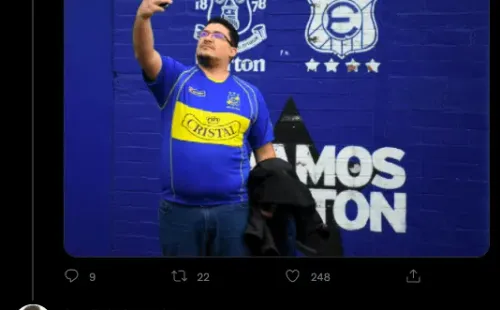 En la foto se puede ver al fanático de los Ruleteros posando con uno de los muros de Goodison Park donde están los escudos de ambos elencos. “¡Hoy tenemos visitas de Everton en Goodison!”, celebraron en redes sociales.