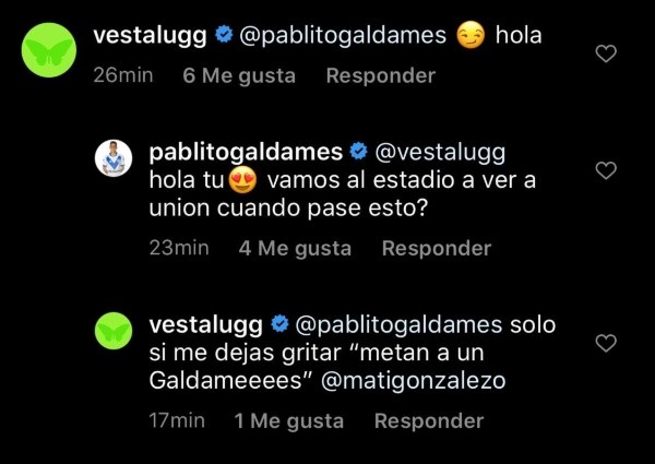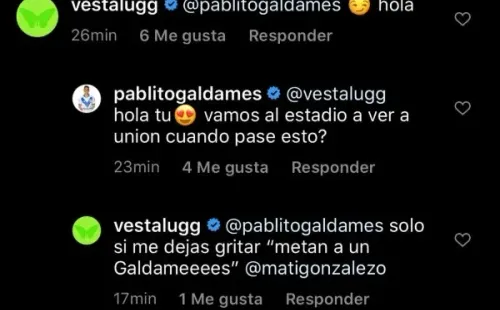 “Hola tú (emoji de cara con corazón). ¿Vamos al estadio a ver a la Unión Española cuando pase esto”, escribió. La respuesta fue inmediata y Vesta puso “Solo si me dejas grita ‘metan a un Galdames’, expresó.