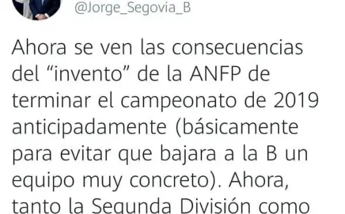 Sobre el tema, una de las voces que se hizo sentir fue la de Jorge Segovia, propietario de Unión Española, al expresarse de manera contundente a través de sus redes sociales. “Ahora se ven las consecuencias del ‘invento’ de la ANFP de terminar el campeonato de 2019 anticipadamente”, expresó.
