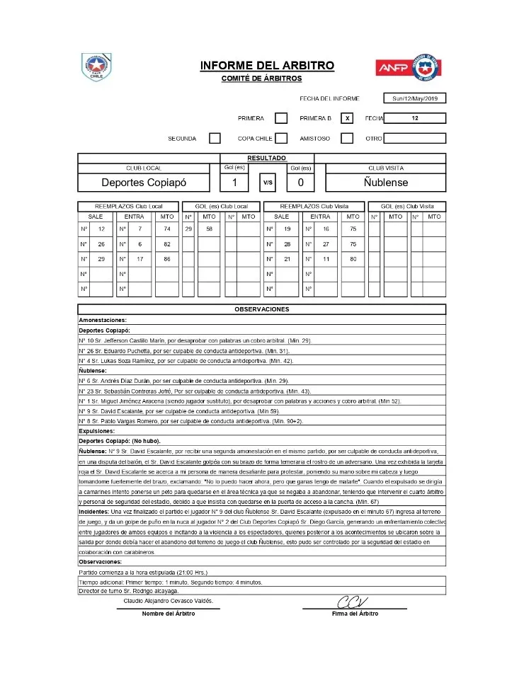 Finalmente, el informe consigna que el jugador volvió a la cancha después del partido “y da un golpe de puño en la nuca al jugador N°2 del Club Deportes Copiapó Sr. Diego García, generando un enfrentamiento colectivo entre jugadores de ambos equipos e incitando a la violencia a los espectadores”.