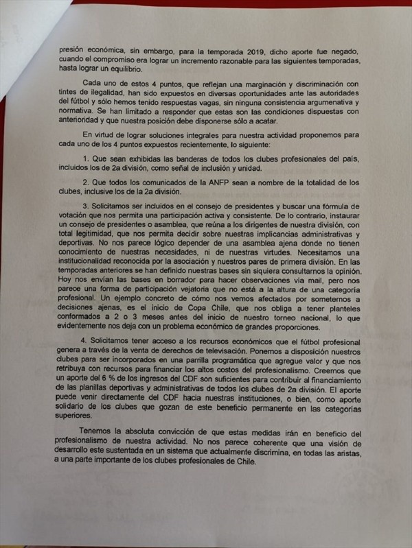 “Con el objetivo de lograr condiciones que hagan sostenible en el largo plazo a la Segunda División Profesional de Chile, hemos hecho un análisis de las situaciones que nos afectan, con sus respectivas propuestas, buscando soluciones que nos permitan participar y competir de manera equilibrada en las competencias organizadas por la ANFP y la Federación de Fútbol de Chile”, inicia el comunicado.