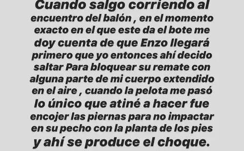 El arquero explicó que se disculpó con Ruiz y dio detalles de por qué golpeó de esa forma a su rival. “Cuando la pelota me pasó, lo único que atiné a hacer fue encoger las piernas para no impactar en su pecho con la planta de los pies y ahí se produce el choque“, sentenció.