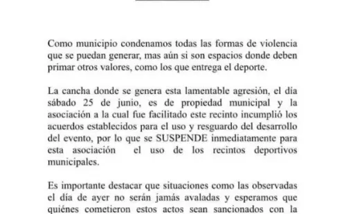 La terrible agresión sufrida por el árbitro Fernando Díaz no dejó indiferente a los ciudadanos de Monte Patria. La situación escaló hasta la Municipalidad, que tras lo ocurrido emitió un comunicado condenando el hecho.