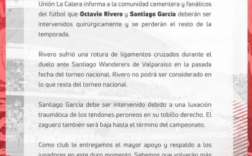 A través de un comunicado, Unión La Calera explicó el momento que viven sus cracks. “Rivero sufrió una rotura de ligamentos cruzados durante el duelo ante Santiago Wanderers de Valparaíso en la pasada fecha. No podrá ser considerado en lo que resta de torneo“.