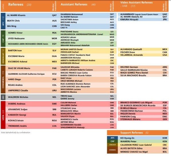 Además de Maza, Conmebol ratificó a los demás árbitros sudamericanos y también confirma la presencia femenina, tal como en el Mundial pasado en India: El paraguayo Mario Díaz de Vivar, el ecuatoriano Guillermo Guerrero, el peruano Diego Haro, el colombiano Andrés Rojas y la uruguaya Claudia Umpierrez.