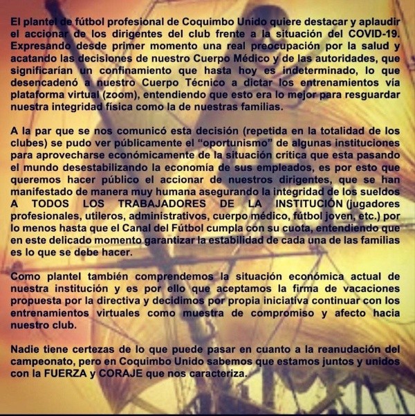 “El plantel de fútbol profesional de Coquimbo Unido quiere destacar y aplaudir el accionar de los dirigentes del club frente a la situación del Covid-19”, parte diciendo el escrito.