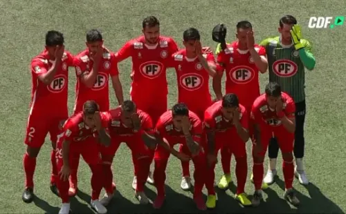Al momento de posar para la foto de rigor, el once de La Calera y un jugador de Iquique se taparon un ojo con la mano como homenaje a las víctimas de la inhumana represión de Carabineros y el Gobierno en las calles.