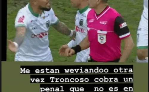 A través de su cuenta de Instagram se quejó de lo sucedido en el minuto 50, cuando los piratas se fueron adelante por medio de un penalti, el cual fue bastante dudoso. “Troncoso cobra otra vez un penal en contra inexistente. Me están web… otra vez con Troncoso”, escribió el exdelantero de la selección de Chile.
