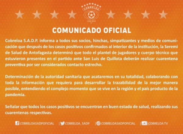 Según el comunicado entregado,“después de los casos positivos confirmados al interior de la institución, la Seremi de Salud de Antofagasta determinó que todo el plantel de jugadores y cuerpo técnico que estuvieron presentes en el partido ante San Luis de Quillota deberá realizar cuarentena preventiva por ser considerados contacto estrecho“.