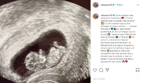 Por su parte, Rafael Olarra manifestó: “¡cómo explicar esta sensación maravillosa! Cómo explicar que no puedo más de amor. Cómo explicar que quiero entregar mi mejor versión. Gracias Lucila Vit por darme esta posibilidad de vivir el milagro que es la vida. Serás la mejor mamita de todo el mundo. Te amo mi amor”.