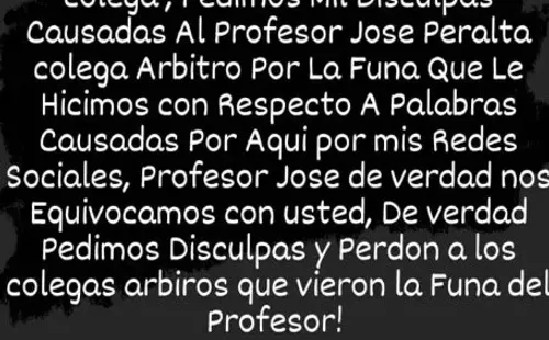 El apuntado se llama José Peralta. Pero este miércoles 25 de enero, Tobar utilizó el mismo medio para ofrecer disculpas públicas al susodicho. “Pedimos mil disculpas al profesor y colega árbitro por la funa que le hicimos con respecto a palabras causadas aquí en mis redes sociales”, dice el primero de los dos mensajes que el mandamás del referato chileno publicó.