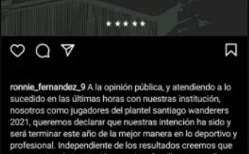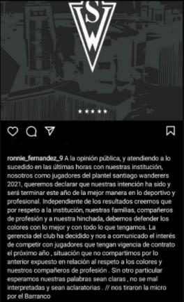 Sin embargo, el delantero Ronnie Fernández fue quien añadió una frase mucho más contundente al final del comunicado y dejó en evidencia su molestia con ls decisiones recientes tomadas dentro de Santiago Wanderers. “Nos tiraron la micro por el barranco”, indicó el atacante.