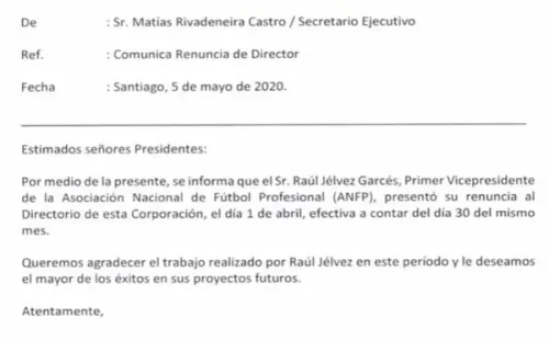 Éste es el documento que oficializa la renuncia de Raúl Jélvez que, de paso, provocó más sismos en Quilín, toda vez que la renuncia fue presentada el 1 de abril y recién se oficializó el 30 del mismo: