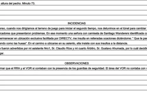“En el descanso, cuando nos dirigíamos al terreno de juego para iniciar el segundo tiempo, nos detuvimos en el túnel para cambiar nuestro intercomunicadores que presentaron problemas. En ese momento, una señora con camiseta de Santiago Wanderers, identificada como hincha invitada a permanecer en ubicación exclusiva facilitada por DirecTV, me insulta en reiteradas ocasiones diciéndome: ‘Qué te pasa ahueonado, están dirigiendo como las hueas’. En el camino a ubicarse en su asiento, ella insiste con sus insultos a la distancia”, dice el escrito del juez.