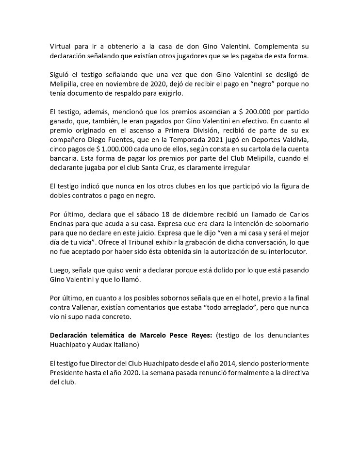 En ese sentido, se constata que los acereros y Audax Italiano presentan el testimonio de Ricardo Fuenzalida y José Huentelaf como testigos, pero además el de Marcelo Pesce Reyes, presidente de Huachipato entre 2014 y 2020 y que seis días antes renunció al directorio.
