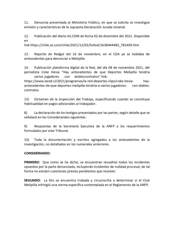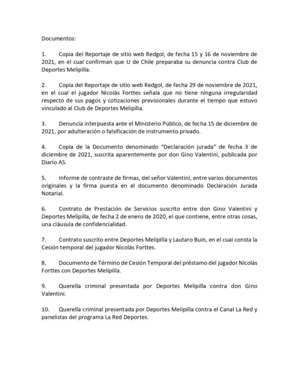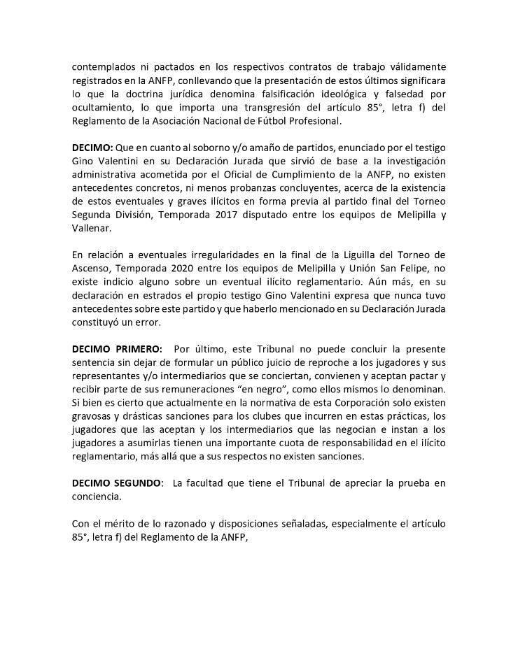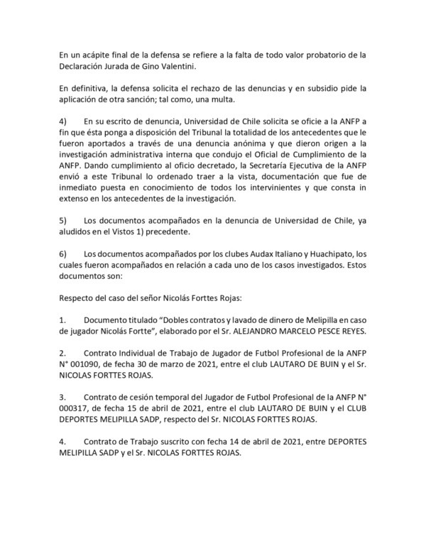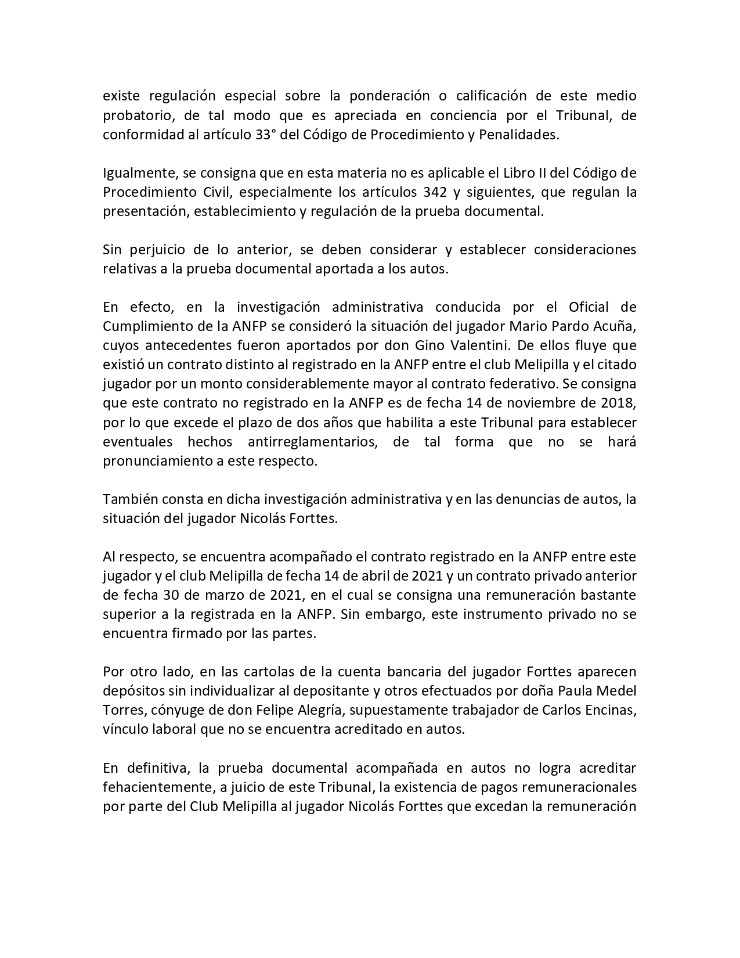 En ese sentido, el Tribunal no considera las pruebas que se entregaron por eventuales ilícitos con el jugador Nicolás Forttes en 2021. Las constancias que allegó Huachipato a la corte fueron desestimadas por el futbolista y Melipilla dijo que se trataba de un préstamo.