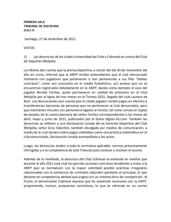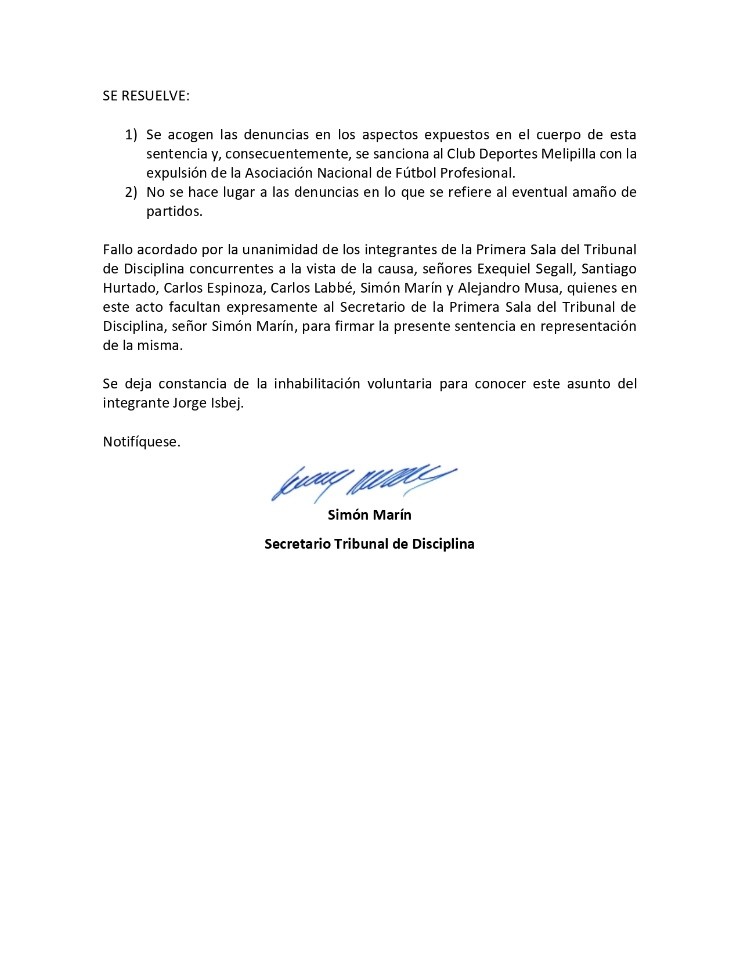 Todo el fútbol chileno esperaba con ansias la publicación de la sentencia del fallo que estableció la expulsión de Deportes Melipilla de la ANFP, por la presentación de documentación falsa que se vincula con dobles contratos de sus jugadores.