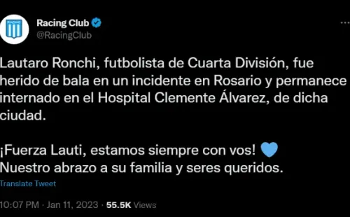 Por cierto, Racing también se manifestó por esta terrible situación que tiene a uno de sus juveniles entre la vida y la muerte. A través de su cuenta oficial de Twitter, la Acadé manifestó su apoyo para los familiares y el círculo más cercano de Lautaro Ronchi.