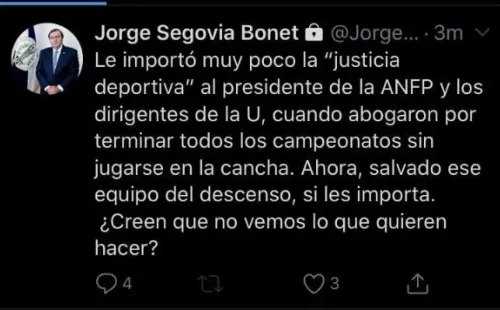 “Le importó muy poco la justicia deportiva al presidente de la ANFP y los dirigentes de la U cuando abogaron por terminar todos los campeonatos sin jugarse en la cancha. Ahora, salvado ese equipo del descenso, sí les importa. ¿Creen que no vemos lo que quieren hacer?”, dijo Segovia.