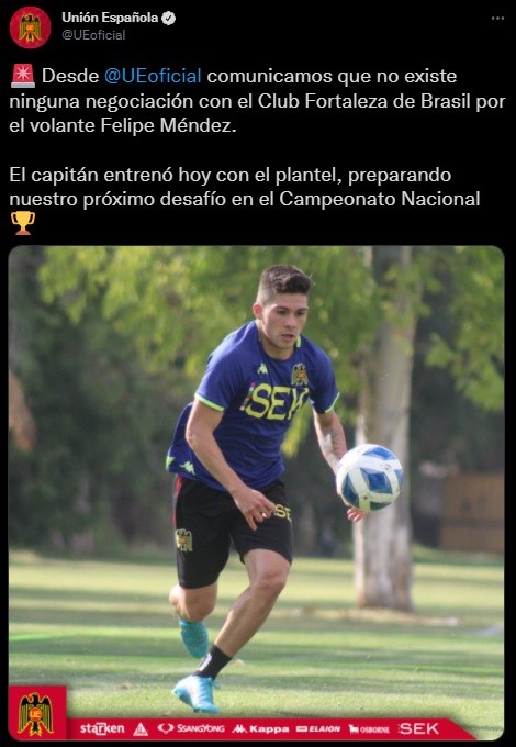 “Desde Unión Española comunicamos que no existe ninguna negociación con el Club Fortaleza de Brasil por el volante Felipe Méndez. El capitán entrenó hoy con el plantel, preparando nuestro próximo desafío en el Campeonato Nacional”, informó UE a través de su cuenta de Twitter.
