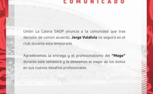 A través de un comunicado, Unión La Calera confirmó la salida de Valdivia “por común acuerdo”. Sin mucho más que explicar, los rojos se despidieron del 10, que ahora busca un nuevo desafío.