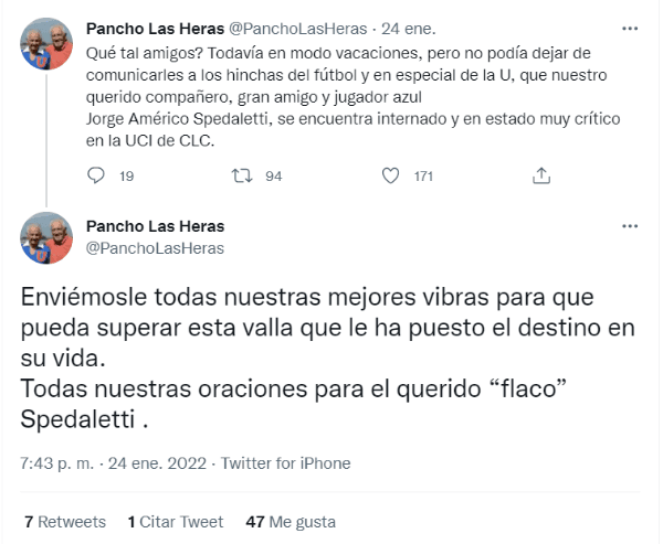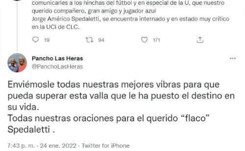Situación que provocó mucha preocupación en el mundo del fútbol, debido al estado de saludque el “Flaco” presentaba. “Enviémosle todas nuestras mejores vibras para que pueda superar esta valla que le ha puesto el destino en su vida. Todas nuestras oraciones para el querido ‘Flaco’ Spedaletti”, complementó Pancho Las Heras.
