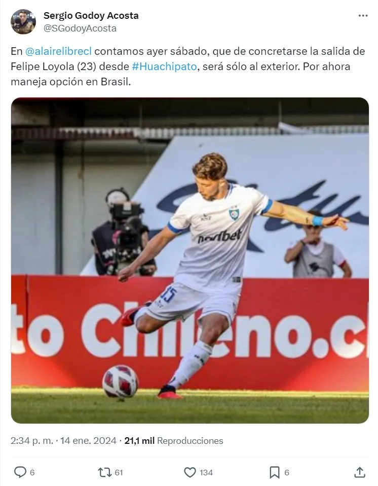 “De concretarse la salida de Felipe Loyola, será sólo al exterior“, advierte el periodista Sergio Godoy, sin detallarse el club interesado en el jugador, lo que echaría por tierra las versiones que lo ponen cerca de ser el primer refuerzo albo para 2024.
