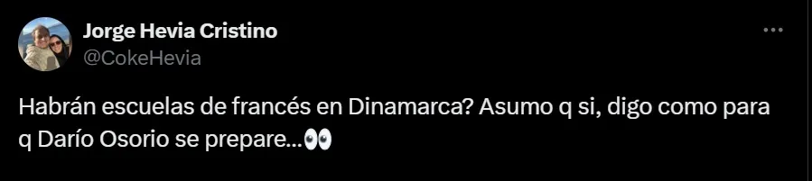 En su cuneta de X (Ex Twitter), el comunicador escribió: “¿Habrán escuelas de francés en Dinamarca? Asumo que sí, digo como para que Darío Osorio se prepare…”.