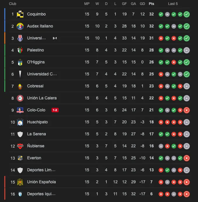 Con este resultado, U. de Chile se acerca a la cima de la Liga de Primera y queda con 31 puntos, a solo una unidad de los punteros, Audax Italiano y Coquimbo Unido. En la otra vereda, Colo Colo se mantiene 9° con 21 puntos, a 10 puntos de los azules y 11 de los líderes.