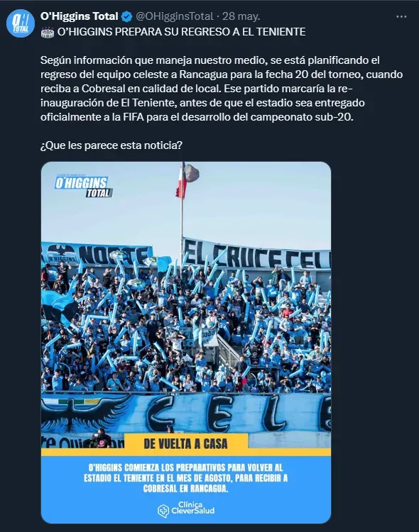 Una de ellas es O’Higgins de Rancagua, la capital de la otrora sexta región será sede de la competencia, junto con Santiago, Valparaíso y Talca, pero que en las últimas horas ya anticipan buenas noticias para dicho equipo.