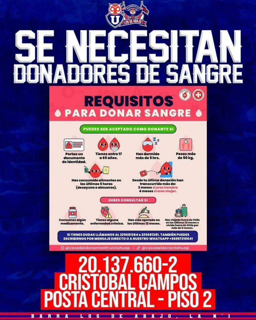 Los hinchas de la U, por medio de las cuentas de la barra Los de Abajo, también están haciendo una campaña para difundir la información sobre los eventuales dadores de sangre.