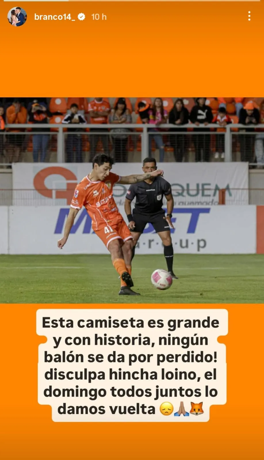 Branco Provoste ocupó sus redes sociales para decirle sentidas palabras a la hinchada de Cobreloa, tras dejar a su equipo con un jugador menos en un momento clave ante San Marcos de Arica.