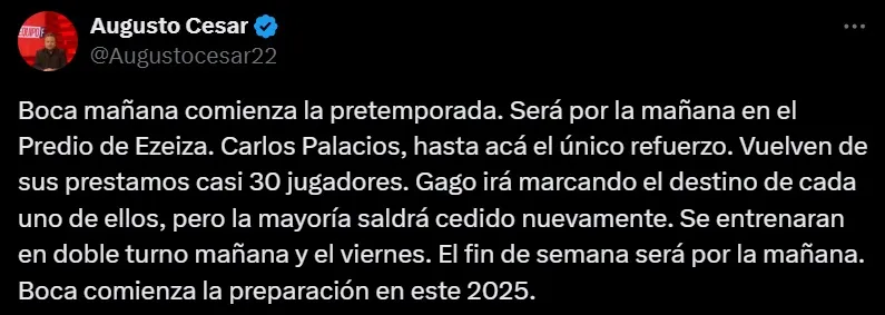 A través de su cuenta de X, el periodista Augusto César, que cubre las noticias sobre el equipo, entregó detalles sobre el entrenamiento de los jugadores. “Boca mañana (hoy) comienza la pretemporada. Será por la mañana en el Predio de Ezeiza. Carlos Palacios, hasta acá el único refuerzo. Vuelven de sus préstamos casi 30 jugadores”.