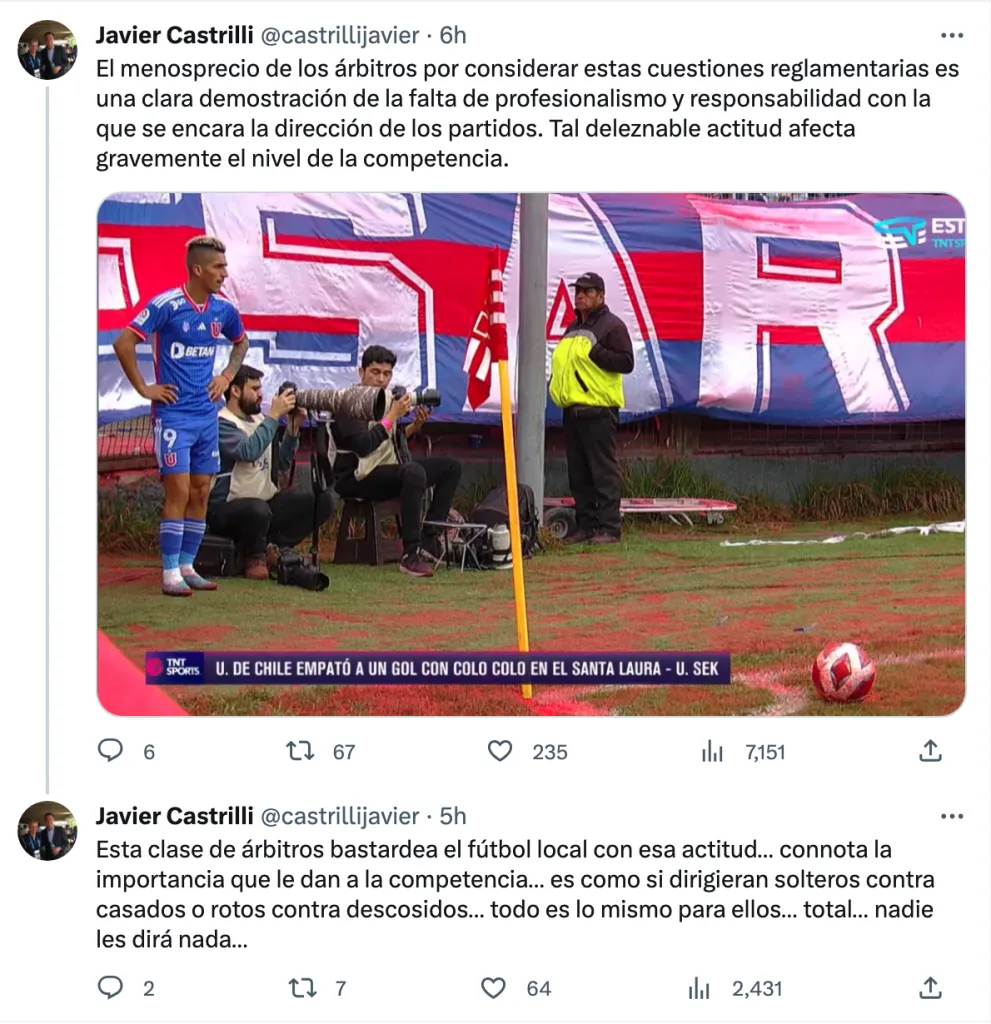 Castrilli tuvo comentarios para el rendimiento de Felipe González, a quien trató de poco profesional por sumar varios errores durante el enfrentamiento entre Universidad de Chile y Colo Colo. En sus palabras, el árbitro del clásico fue incluso irresponsable.