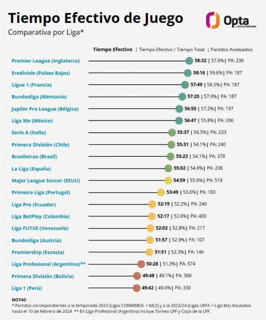 Opta pone al torneo nacional en la octava posición a nivel mundial, pues deja al Brasileirao en el noveno lugar con 55:23 minutos, y la Liga Argentina en la 18° ubicación, con apenas 50:28 minutos.