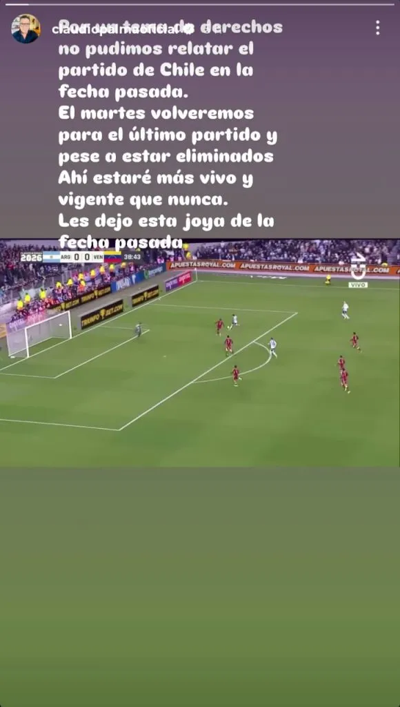 Claudio Palma ocupó sus redes sociales para dar a conocer su momento post salida de TNT Sports, dejando en claro que seguirá relatando a la selección chilena con la misma pasión de siempre.