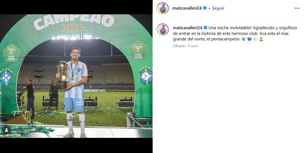 El jugador llegó este 2025 a Paysandu en donde compartió su alegría tras obtener con el equipo el Campeoao 2025. “Una noche inolvidable! Agradecido y orgulloso de entrar en la historia de este hermoso club. Acá está el más grande del norte, el pentacampeón”, escribió en sus redes.