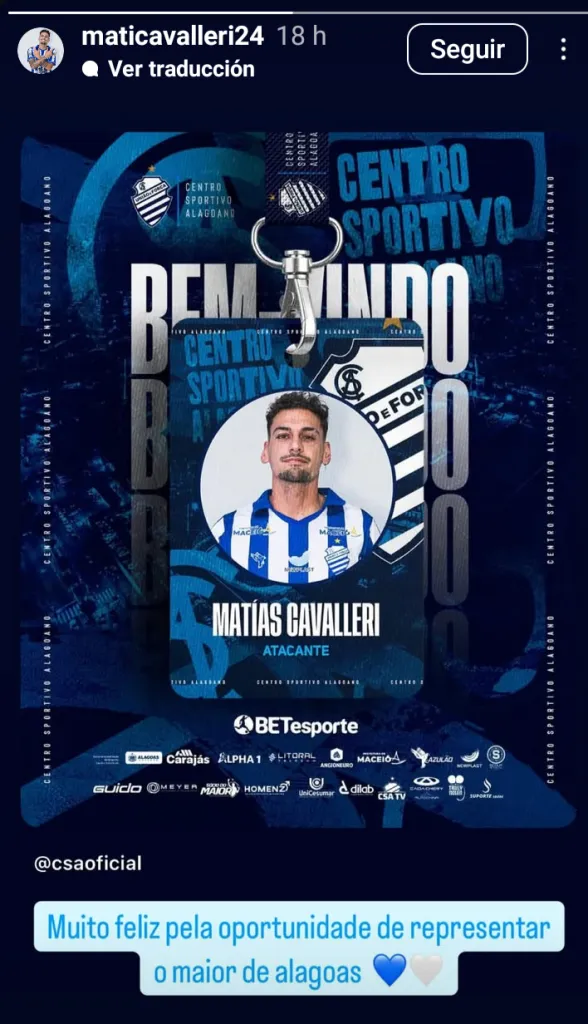 “Hay un refuerzo chileno para el Azulão. El equipo más grande de Alagoas ha fichado al delantero Matías Cavalleri, exjugador del Paysandú, de 27 años. El jugador ya está en Maceió y forma parte de la plantilla del Azulão. Cavalleri ha jugado en Unión La Calera, Palestino y Curicó Unido, todos en Chile”.