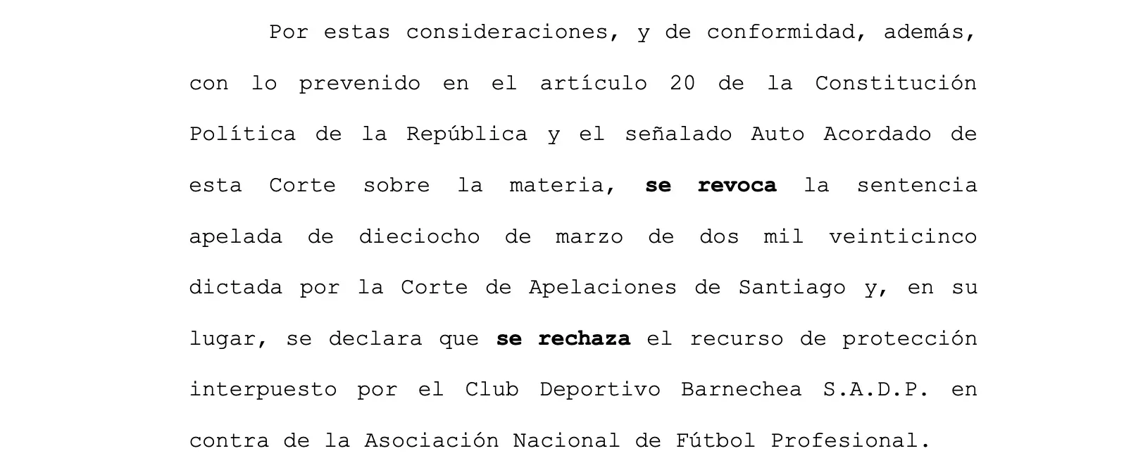 “Las decisiones impugnadas se dictaron por los órganos que establece la ANFP de conformidad con su reglamentación interna en el ámbito de sus propias competencias, al establecer la suspensión y, luego, la cancelación de la licencia del club por las infracciones cometidas y paralelamente, sanciones disciplinarias y deportivas derivadas de este hecho”, indica el fallo.