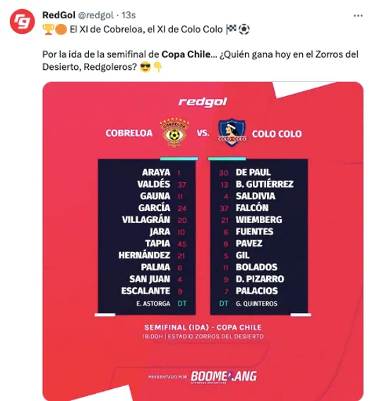La Copa Chile vive la semifinal del torneo, ya en la recta final para conocer a un nuevo campeón. En el duelo de ida de una de las llaves, Cobreloa recibe en condición de local a Colo Colo.