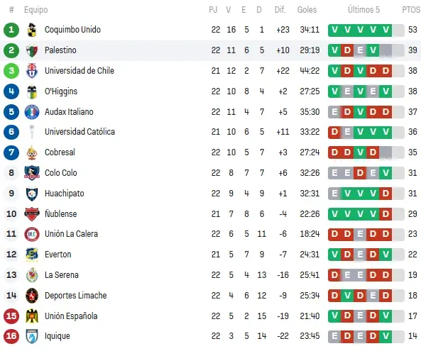 Tras el pitazo final, y con Cobresal 2-1 Palestino, así queda la tabla de posiciones de la Liga de Primera donde Universidad de Chile también mira de reojo lo que ocurre en su lucha por el título con Coquimbo Unido. Además, Colo Colo se aleja de la zona de Copa Sudamericana.