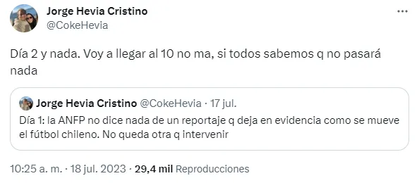 “Día 1: la ANFP no dice nada de un reportaje que deja en evidencia cómo se mueve el fútbol chileno. No queda otra que intervenir”, manifestó Hevia en Twitter.