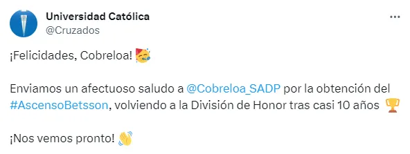 Y la Católica expuso: “¡felicidades Cobreloa! Enviamos un afectuoso saludo a Cobreloa por la obtención del Ascenso, volviendo a la división de honor tras casi 10 años. ¡Nos vemos pronto!”.