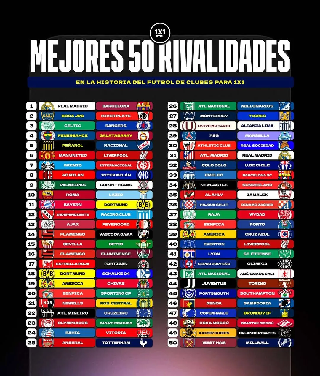 Prueba de esto, es un listado que realizó el medio digital 1x1FTBL, originaria de México con más de 162 mil seguidores en Instagram, que colocó al Superclásico chileno entre las 50 mayores rivalidades del fútbol mundial.