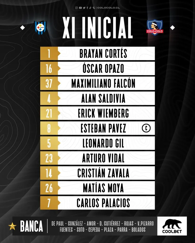 Jorge Almirón determinó el once inicial de Colo Colo con Brayan Cortés al arco; Óscar Opazo, Maximiliano Falcón, Alan Saldivia y Érick Wiemberg en defensa; Esteban Pavez, Leonardo Gil y Arturo Vidal en mediocampo; Cristián Zavala, Matías Moya y Carlos Palacios en ataque.