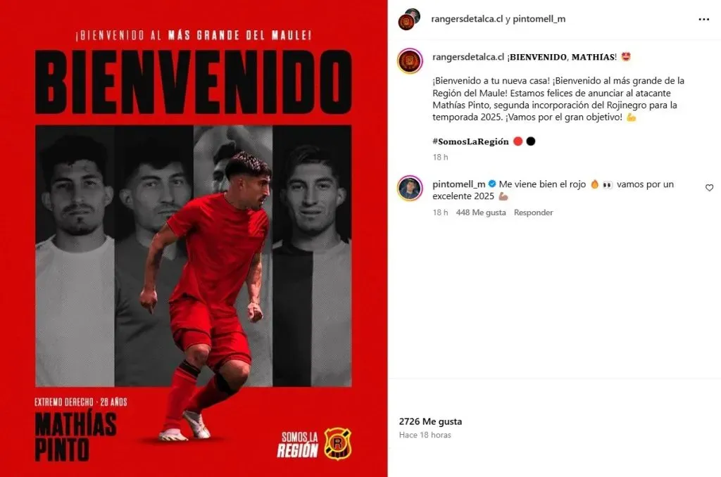 La publicación continúa diciendo “¡Bienvenido a tu nueva casa! ¡Bienvenido al más grande de la Región del Maule! Estamos felices de anunciar al atacante Mathías Pinto, segunda incorporación del Rojinegro para la temporada 2025. ¡Vamos por el gran objetivo!”.
